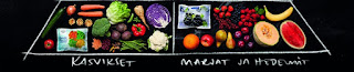 Kaikista tärkeintä on syödä runsaasti kasviksia, marjoja ja siihen vielä hedelmä tai pari. Ruokapyramidi painottaa lautasmallia eli sitä että ensin lautaselle kasataan kasvikset - vasta sitten viljatuotteet ja liha. Oma ohjeeni on että syö täysviljaa mutta ainoastaan puolet kasvisten määrästä.